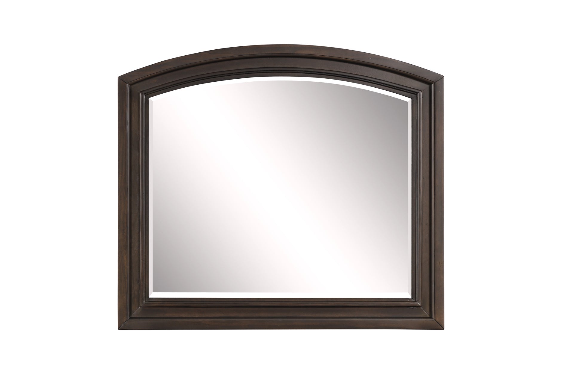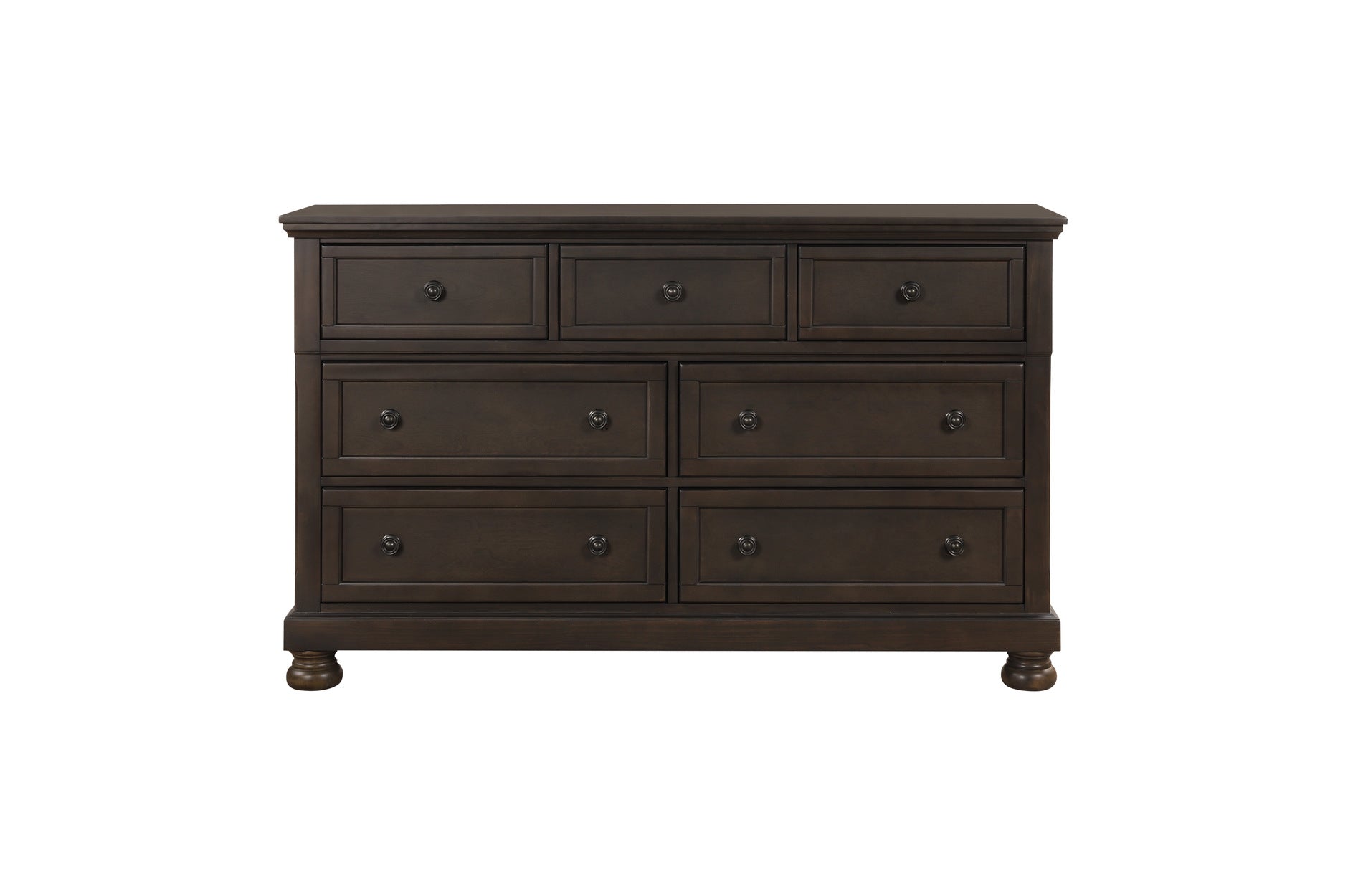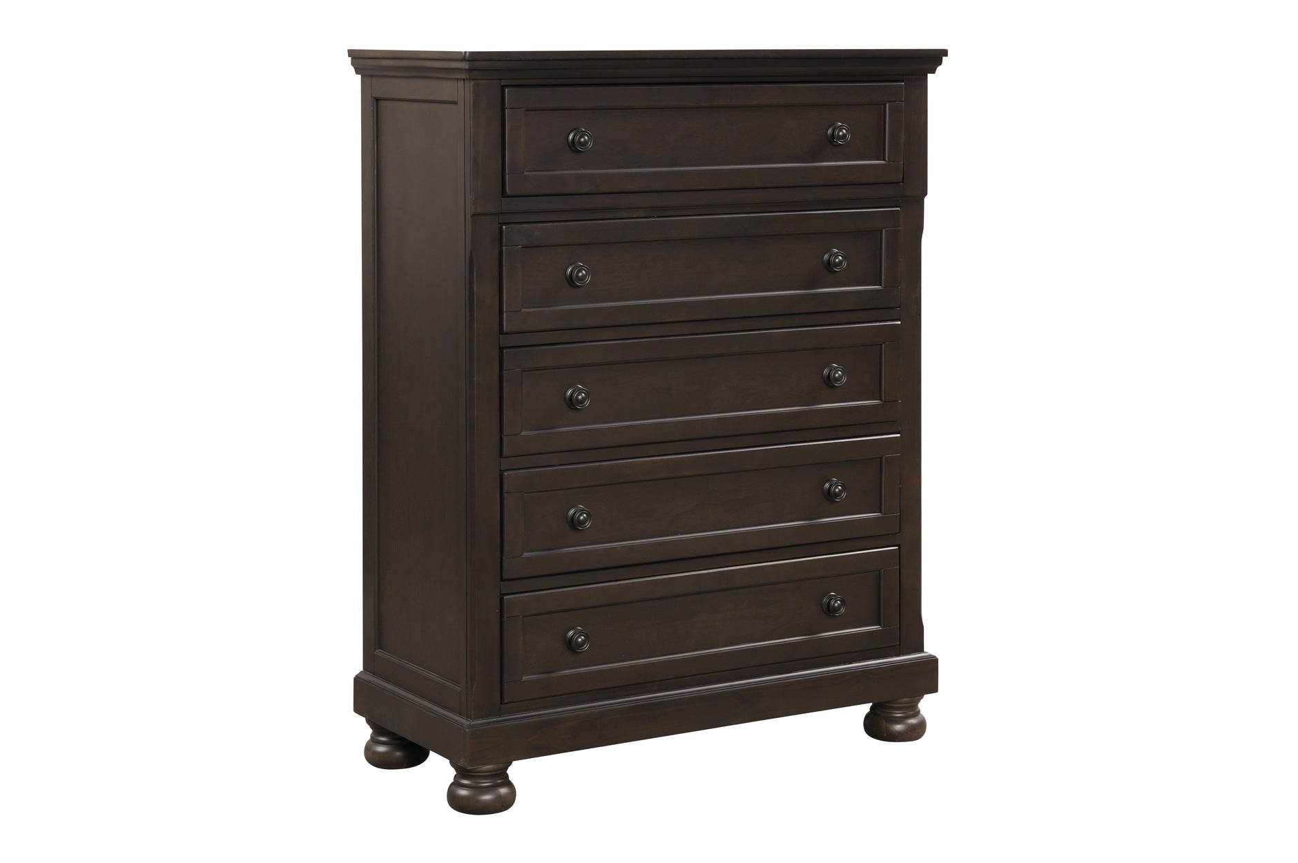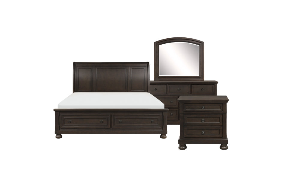 This 5-piece bedroom set combines transitional style with a grayish brown finish. It includes a sleigh headboard, nightstand, dresser, and footboard with storage drawers, all accented with decorative knob hardware and bun feet.