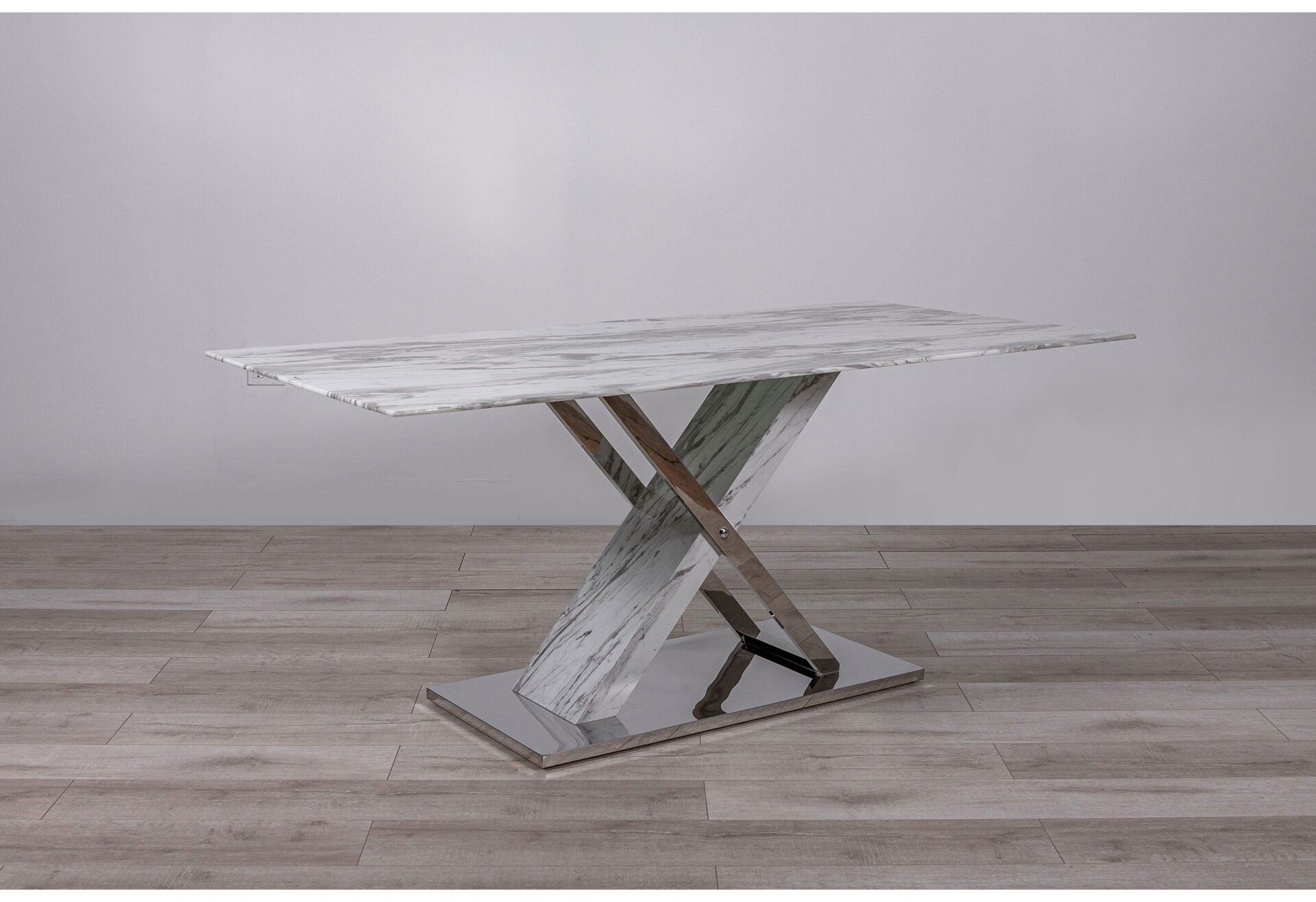 Get the classy vibe of Carrara marble with this fab glass-top dining table. The x-base design and polished stainless steel accents give it an extra touch of style. It's perfect for hosting all your fancy gatherings.