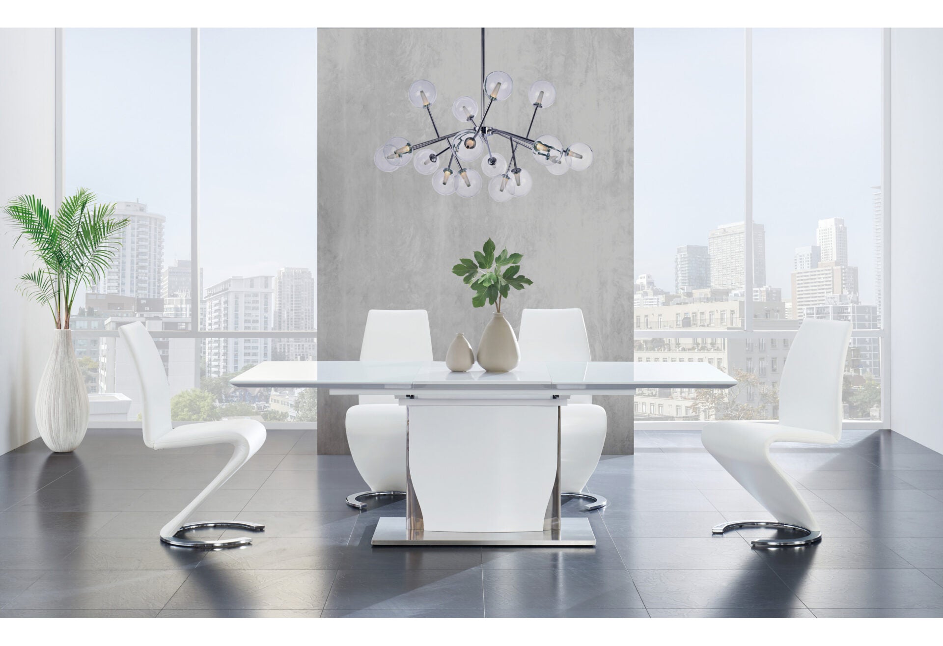 Get ready to impress with this cutting-edge and minimalist design that is both eye-catching and functional for your modern dining area. The high gloss white finish, accented by brushed stainless steel, is effortlessly stylish. The table's glass top, extending from 63in to 87in, allows for ample seating space and the self-storing butterfly leaf conveniently tucks away under the tabletop.