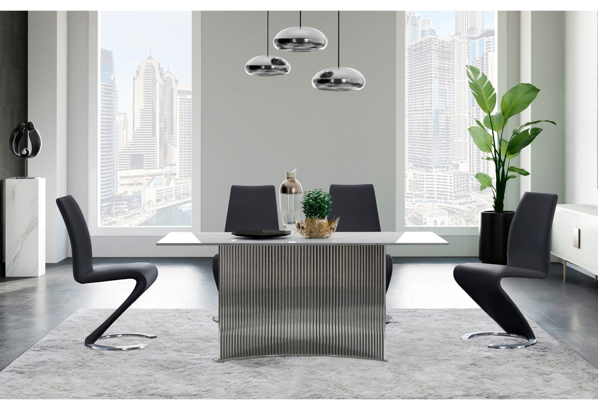 The D7070DT and D9002DC BLACK: a perfect combo for classy vibes in your dining room. A tough, faux marble ceramic tabletop for both elegant meals and easy clean-up. Plus, the modern stainless steel base adds an extra touch of style. Complete with 4 chic chairs, this set will elevate your dining experience in a snap.