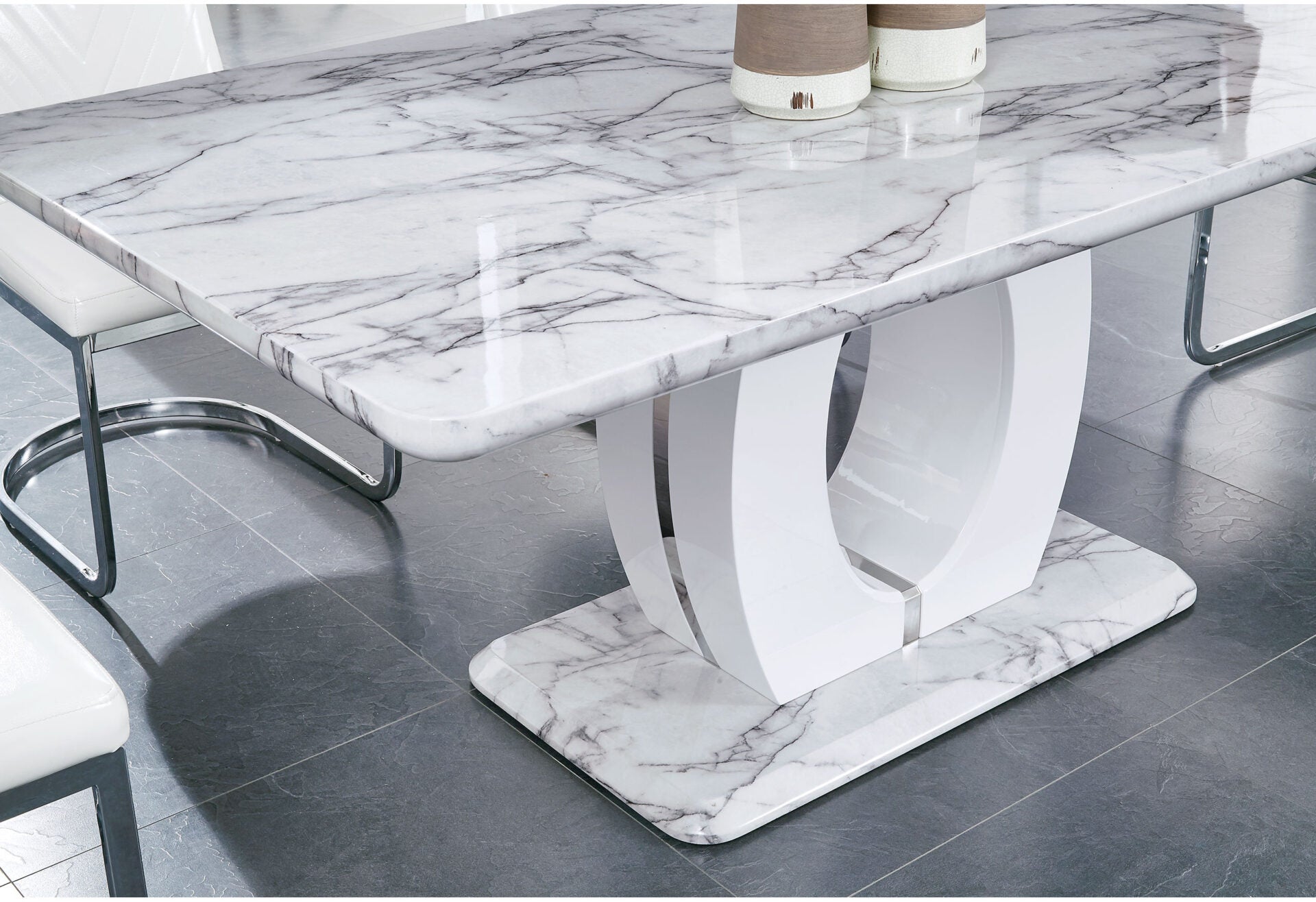 Unleashing the charm and warmth of a dining room, this Flora Furniture dining table proves to be the perfect addition to any home. With its classic and contemporary oval design, marble inspired top, and chrome banding accents, this table creates a playful and inviting atmosphere for entertainment.