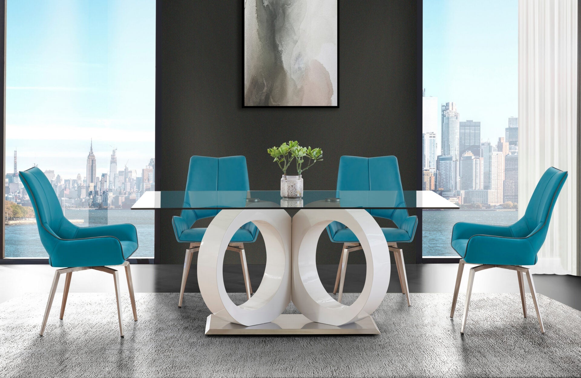 Get ready to add a touch of artistic flair to your dining room with this geometrically-designed, elegant dining table. Its sculptural legs in a white finish, rectangular tempered glass top, and chromed base make for a stunning focal point.