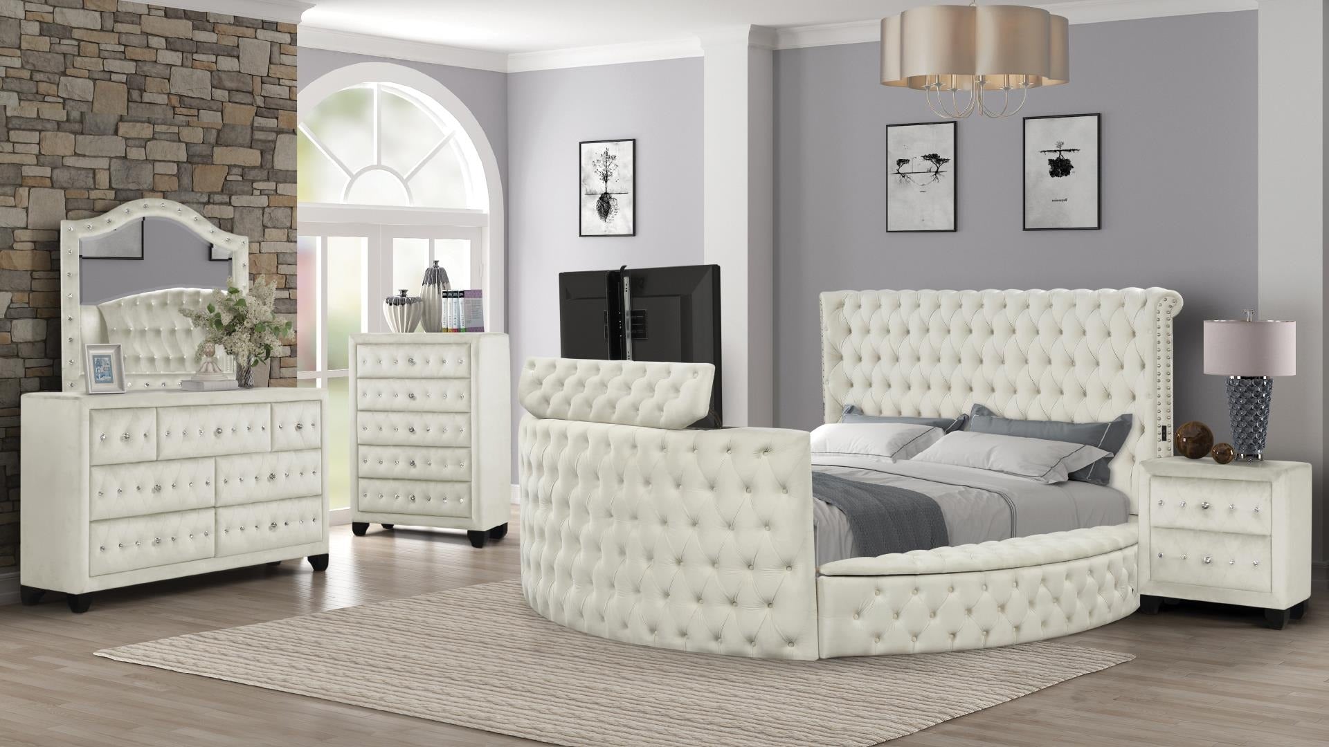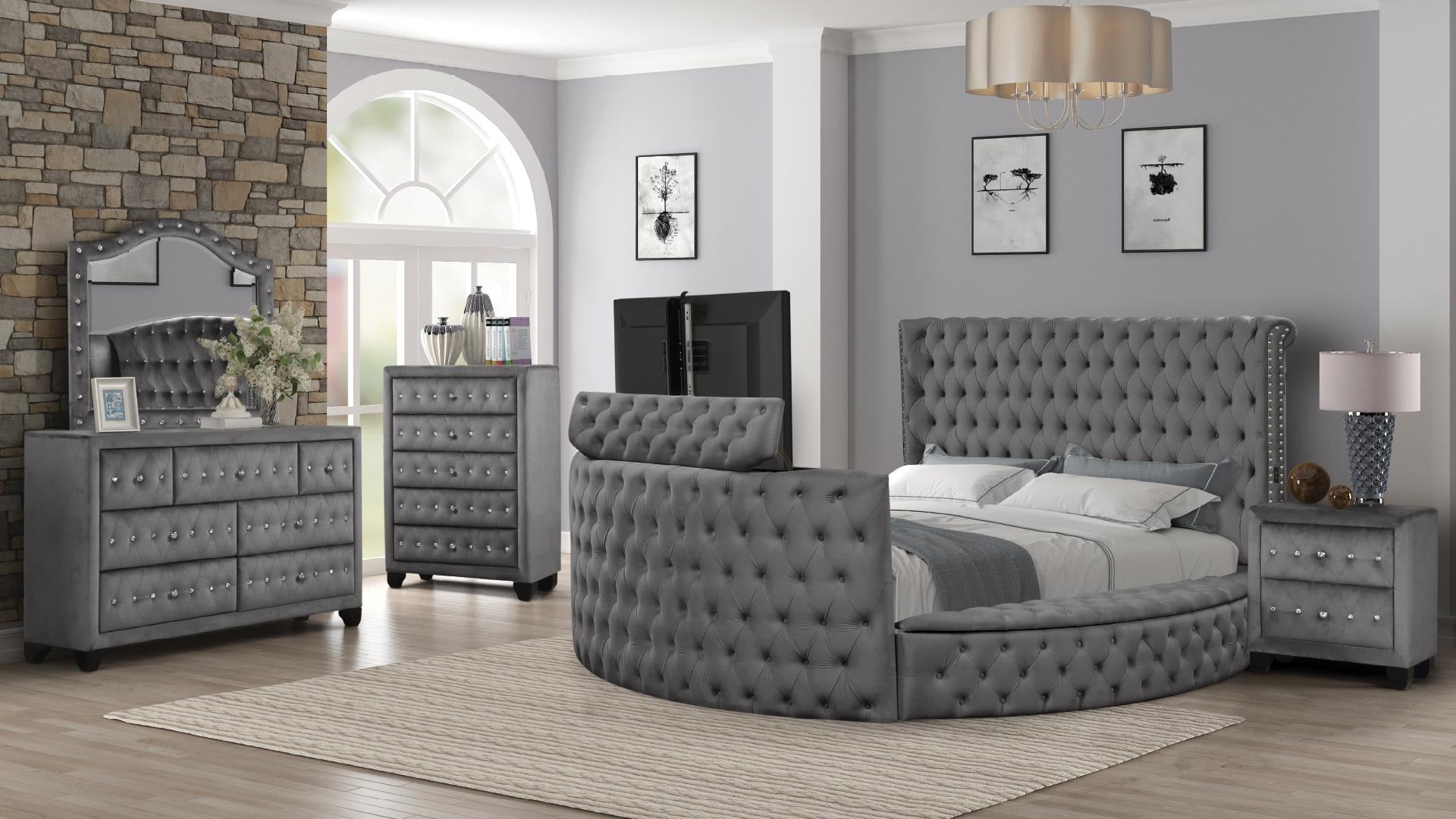 The Naya Bedroom Set combines five coordinated pieces with a motorized TV concealment system, delivering both style and practicality for modern bedrooms.
