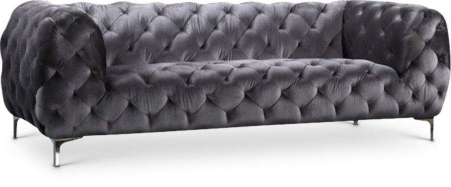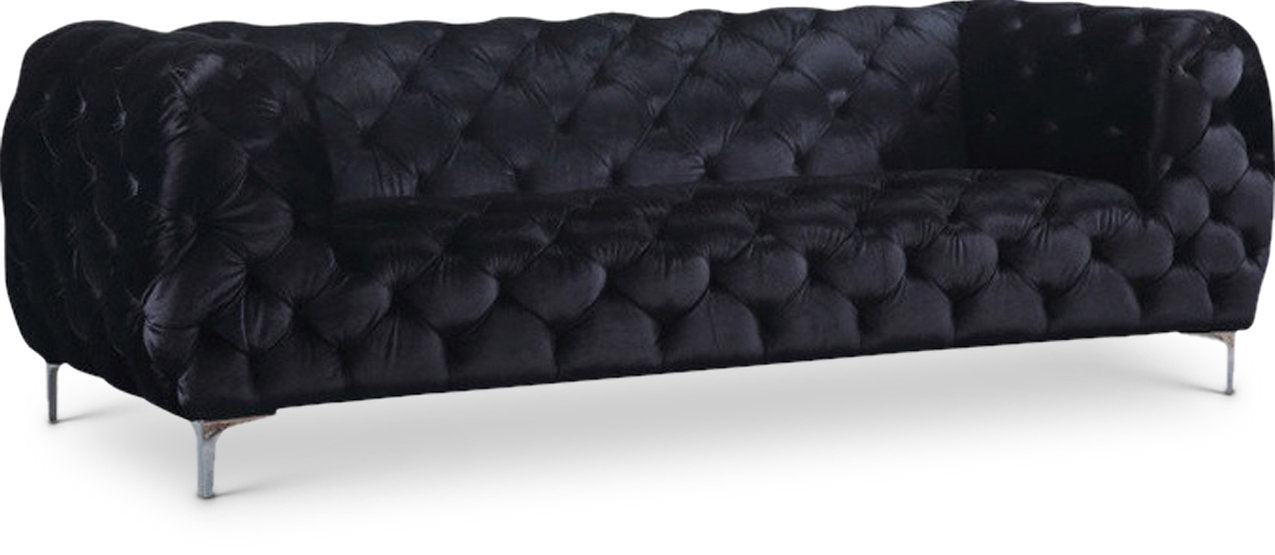 The Mercer Velvet Sofa combines sophisticated design with lasting comfort. Upholstered in rich velvet with high-density foam cushioning, it features a modern tufted aesthetic and solid wood frame reinforced by chrome legs for durability and style.