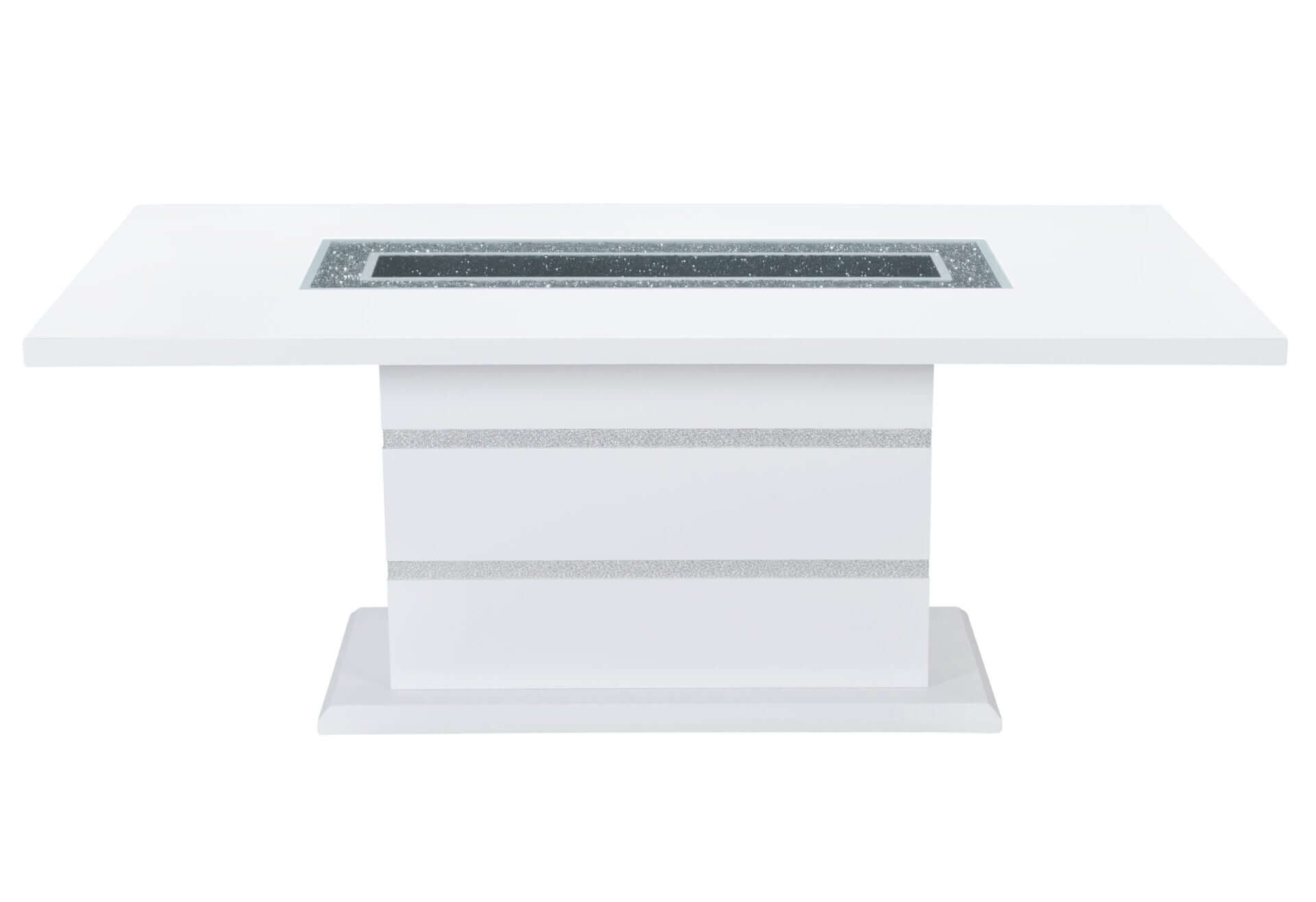 The MONACO WHITE DINING TABLE + 4 MONACO DINING CHAIR set features a high-gloss white finish with silver accents and a decorative glass center inlay. Built from MDF, glass, and acrylic with a sturdy pedestal base, this rectangular dining ensemble delivers both style and durability for your home.